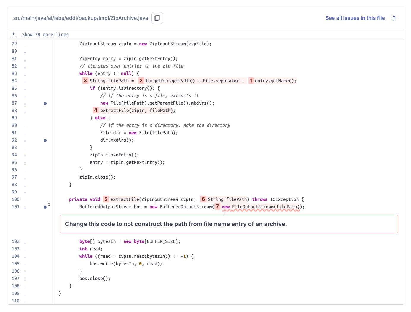 The code scan finished quickly, and SonarQube raised a Zip Slip vulnerability. This was a 0-day vulnerability at the time and was later assigned CVE-2025-32779. You can view the issue on SonarQube Cloud (no account required) to follow along and explore the code. Let's dive in: