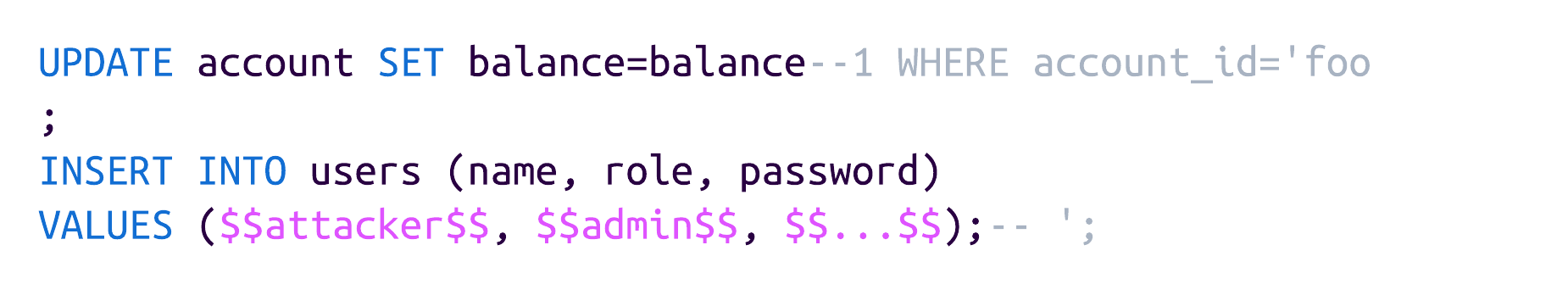 After confirming that it is possible to alter the syntax of a prepared statement by causing the creation of a line comment, we wanted to know if it's just possible to comment out parts of a query or if attackers could even inject new syntax. We experimented with several queries until we realized another fact about PostgreSQL: multi-line string literals are supported!