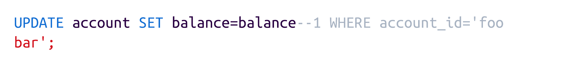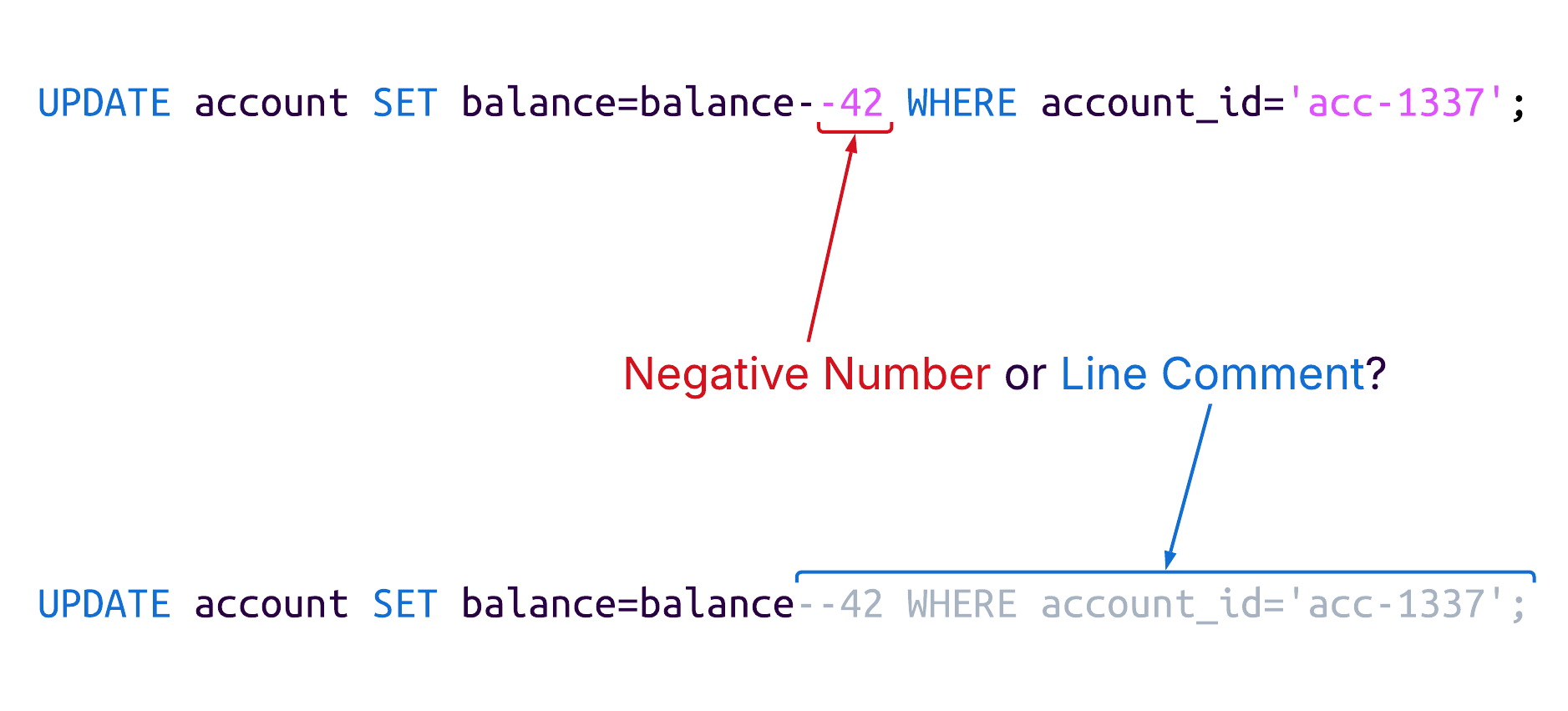 The syntax has become ambiguous! Should the database parse it as subtracting -42, or is there a line comment? To avoid this ambiguity, MySQL requires a whitespace after the -- start-comment sequence. But what about other databases?