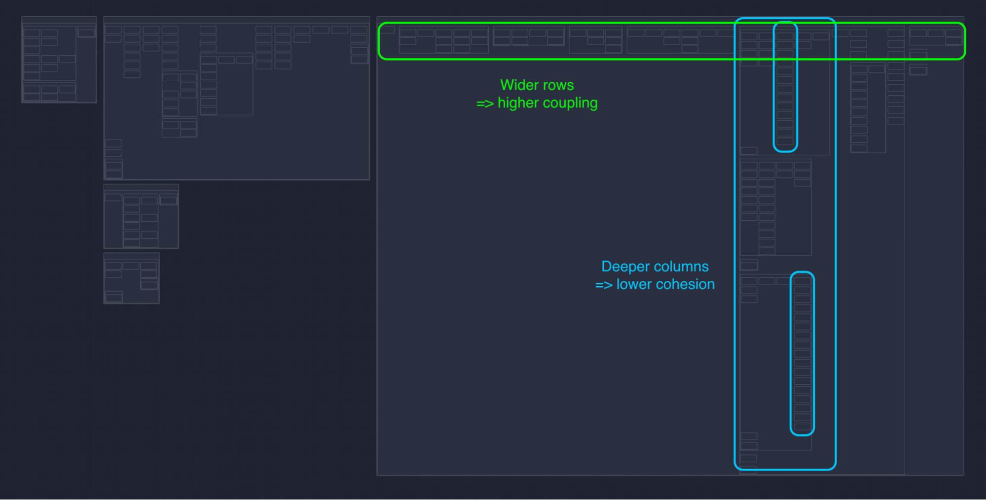 - Wider rows indicate more cohesion, therefore horizontal components contain long chains of components that depend on each other in sequence. This is typical of business logic, with many abstractions, where each one encapsulates knowledge and delegates work to others. You find these often in the middle of your system, sandwiched between entry points and low level utilities.