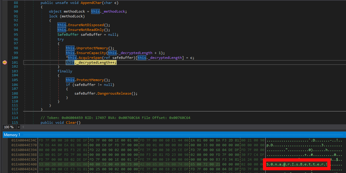 However, even in that case, the .NET implementation is forced to decrypt the protected memory every time a character is appended to the SecureString buffer. If we go back to the test case execution and inspect the program’s memory during the addition of the last character of the secret value, we can observe that the secret appears in cleartext.