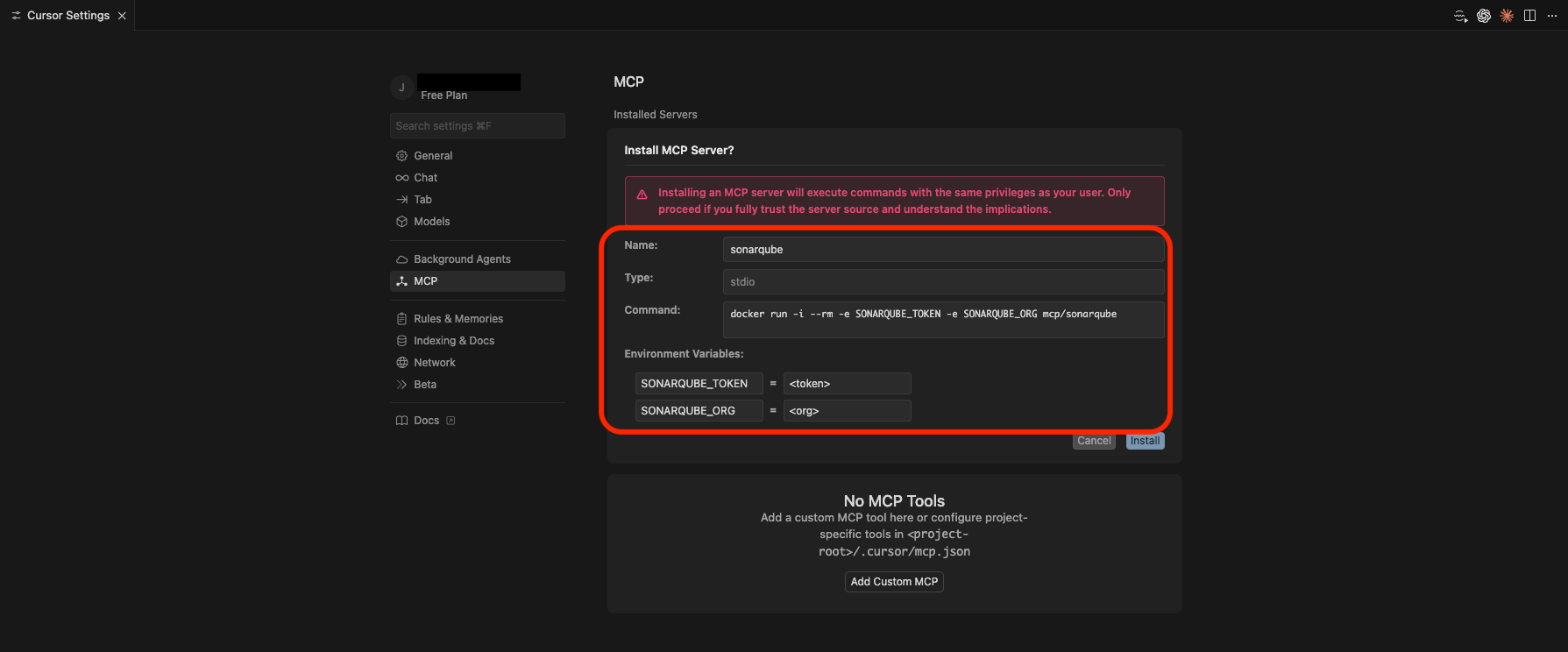 - When Cursor opens, you need to supply the SONARQUBE_TOKEN and SONARQUBE_ORG