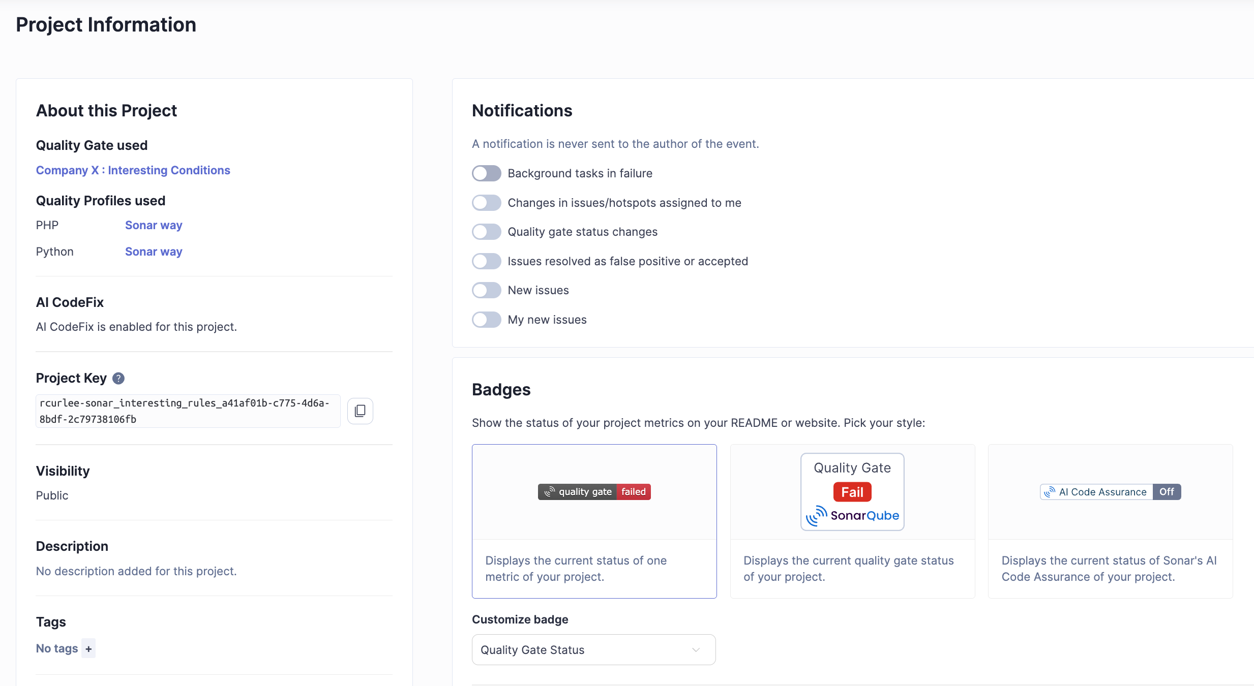 • AI Code Assurance: The status of analyzing AI-generated code within a project. Statuses include AI Code Assurance Off, AI Code Assurance Pass, and AI Code Assurance Fail.