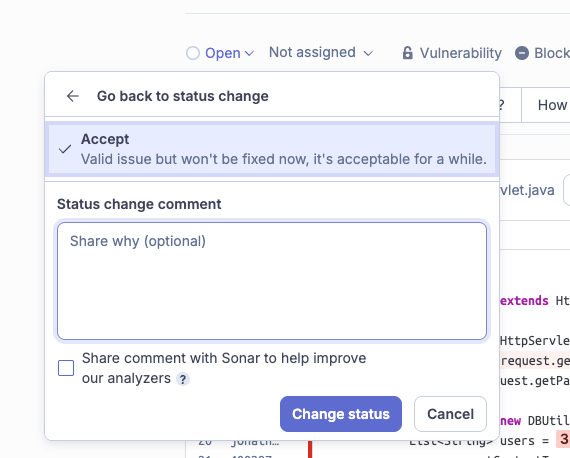 - Accept (Won’t fix): Use this when you acknowledge the issue but determine the implementation is correct for the specific business case (e.g., a specific algorithm requirement).