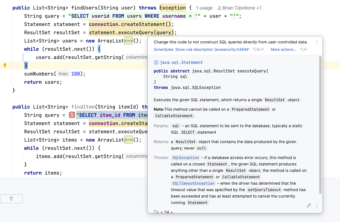 While SonarQube for IDE is powerful, certain complex issues require a broader view of the application. For example, a SQL injection vulnerability might involve data traveling from a controller, through a service, and into a repository. Tracing this path requires taint analysis.