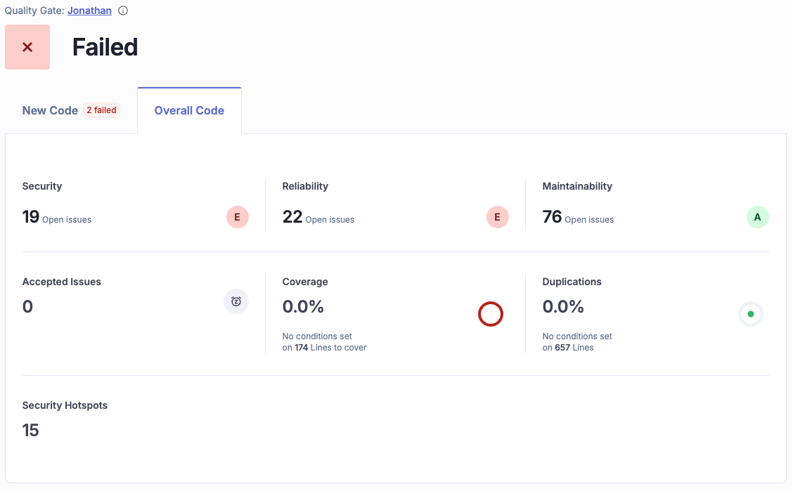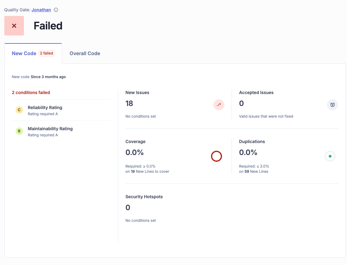 - New code tab: This is your daily focus. It shows the health of code changed in the current period. Keeping this green ensures you are not introducing new debt.