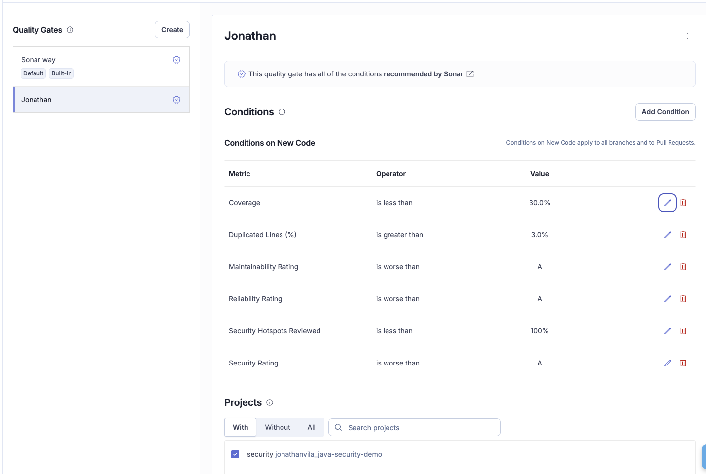 - Configuration: Set your quality gate condition to check "Coverage on New Code > 80%."
