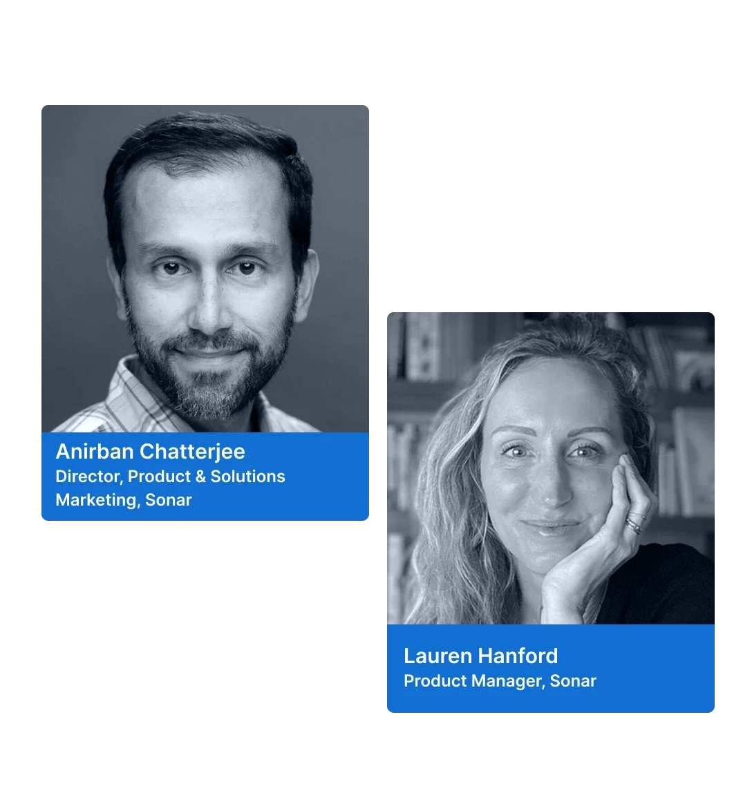This webinar will unpack the key findings from our "State of Code: Security" report. Hosted by Anirban Chatterjee, Director of Product Marketing at Sonar, and Lauren Hanford, Director of Product Excellence at Sonar and former VP of Product at Tidelift, this session will provide a crucial look at the real-world security issues developers are facing today.